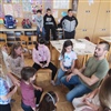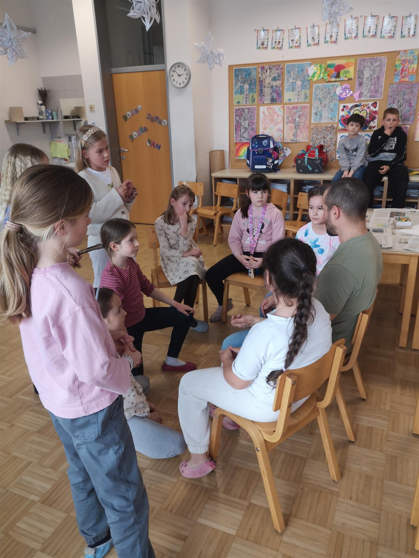 Naš David je na vsa odgovoril na enostaven in prikupen način. Šolski dogodek ni bil le predstavitev - bil je pogovor, poln radovednosti, smeha in iskrene otroške energije. Ni manjkalo šal, nasmehov, petja in plesa.