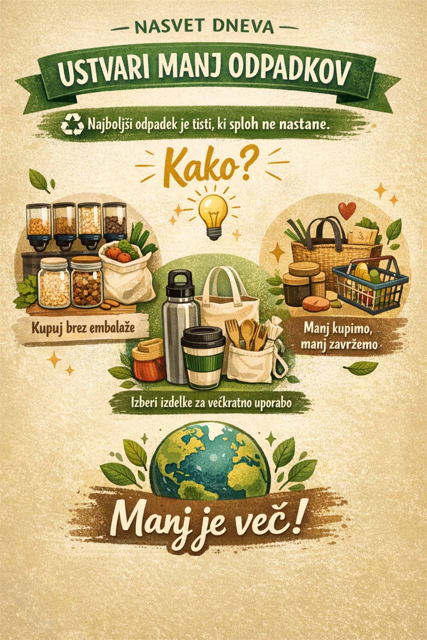 USTVARI MANJ ODPADKOV Nasvet dneva Datum objave: petek, 17. april 2026 Najboljši odpadek je tisti, ki sploh ne nastane. Kako? • kupuj brez embalaže • izberi izdelke za večkratno uporabo • manj kupimo, manj zavržemo